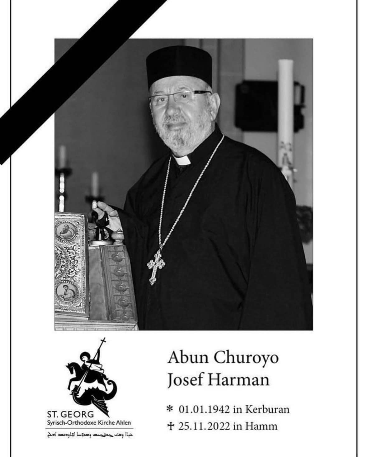Abuna Churoyo Josef Harman war Priester in Ahlen und gehörte zu den ersten syrisch orthodoxen Priestern in Deutschland. Bemerkenswert war seine Tätigkeit als Übersetzer, er half vielen Gemeinden und war eine Säule für unsere Kirche in Deutschland.