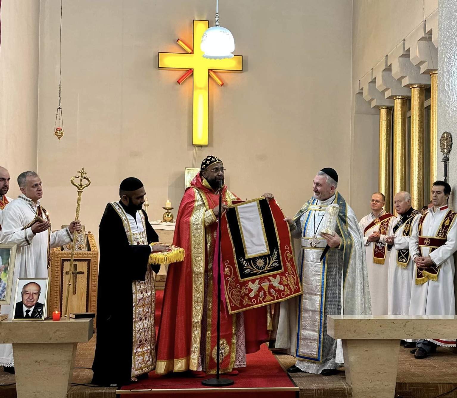 Während der Predigt hat Hasyo Theophilus Kurjakus von der Situation der syrisch-orthodoxen Christen in Indien berichtet. Anschließend hat er unserem Priester Abuna Murat Üzel Geschenke für den Umbau unserer Kirche sowie ein Kreuz übergeben.