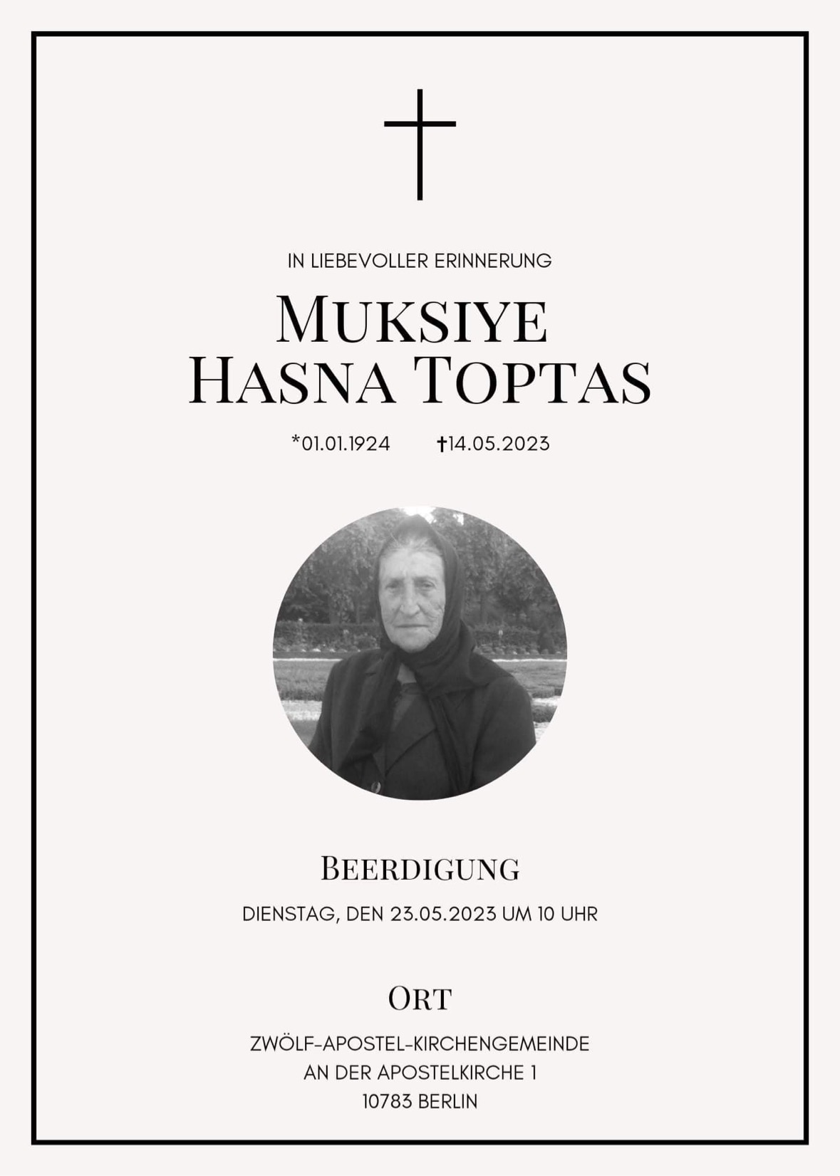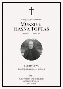 Es tut uns sehr leid zu hören, dass unser jahrelanges und treues Gemeindemitglied, Muksiye Hasna Toptas, verstorben ist. Wir möchten unserer tiefsten Anteilnahme und unser aufrichtiges Beileid an die Familie von Muksiye Hasna Toptas zum Ausdruck bringen, insbesondere an ihren Sohn Muksi Aziz Toptas und ihre Töchter, die sich liebevoll um sie gekümmert haben.